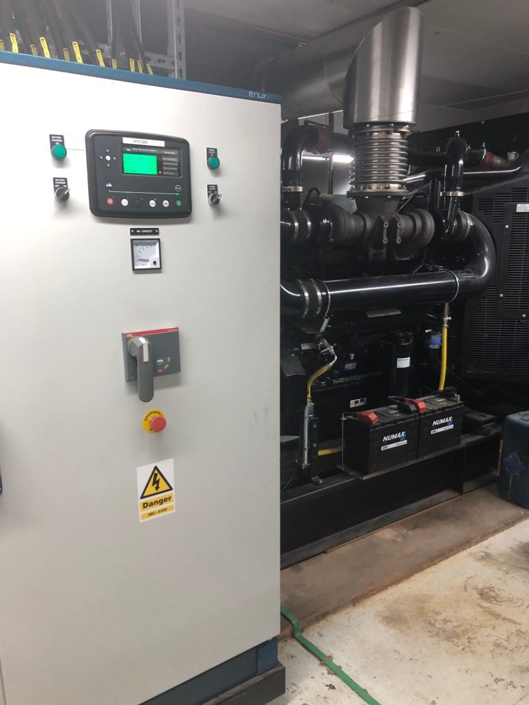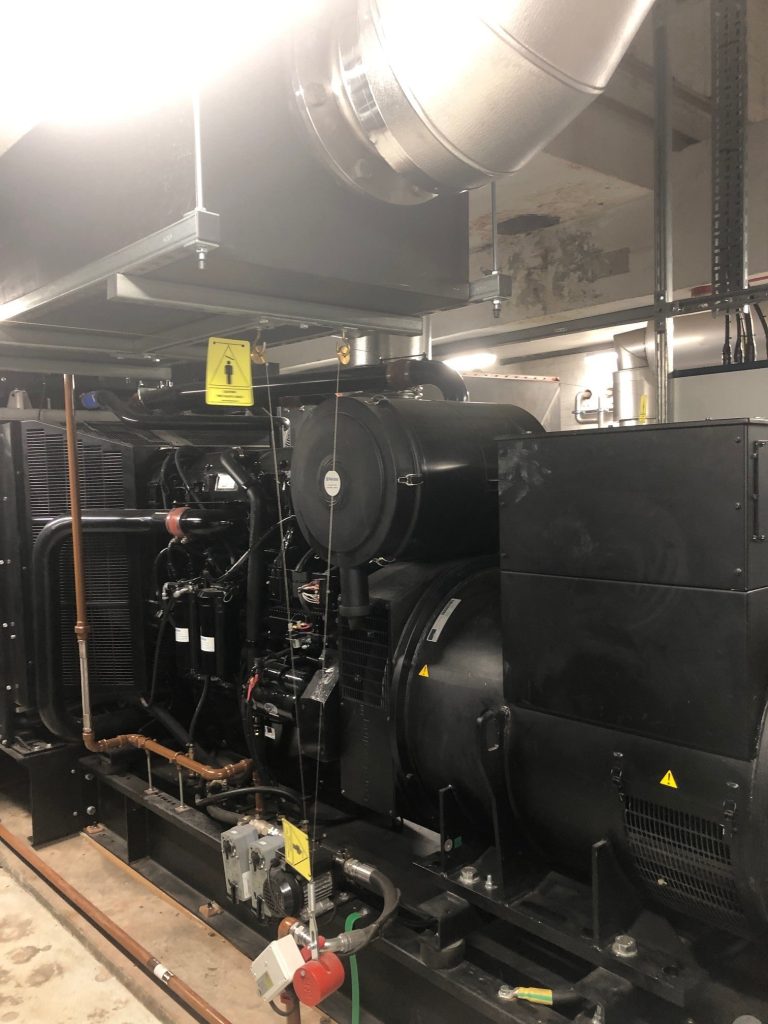 These photos show the generator supply and installation works completed at Broomfield Hospital. We supplied two 650kVA open generators and a parallel switchboard as part of a major power upgrade, replacing the original 2 x 300kVA units with 2 x 650kVA units in the existing plant room. To accommodate the increased capacity within the same space, bespoke silencers were designed and the exhaust flue was re-routed.